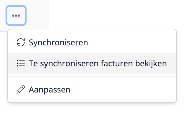 Ga naar Instellingen > Apps > Exact Online en kies op het menu bij jouw configuratie. Bekijk de te synchroniseren facturen om te zien of er nog een factuur in Flux staat die nog niet naar Exact Online is verstuurd.